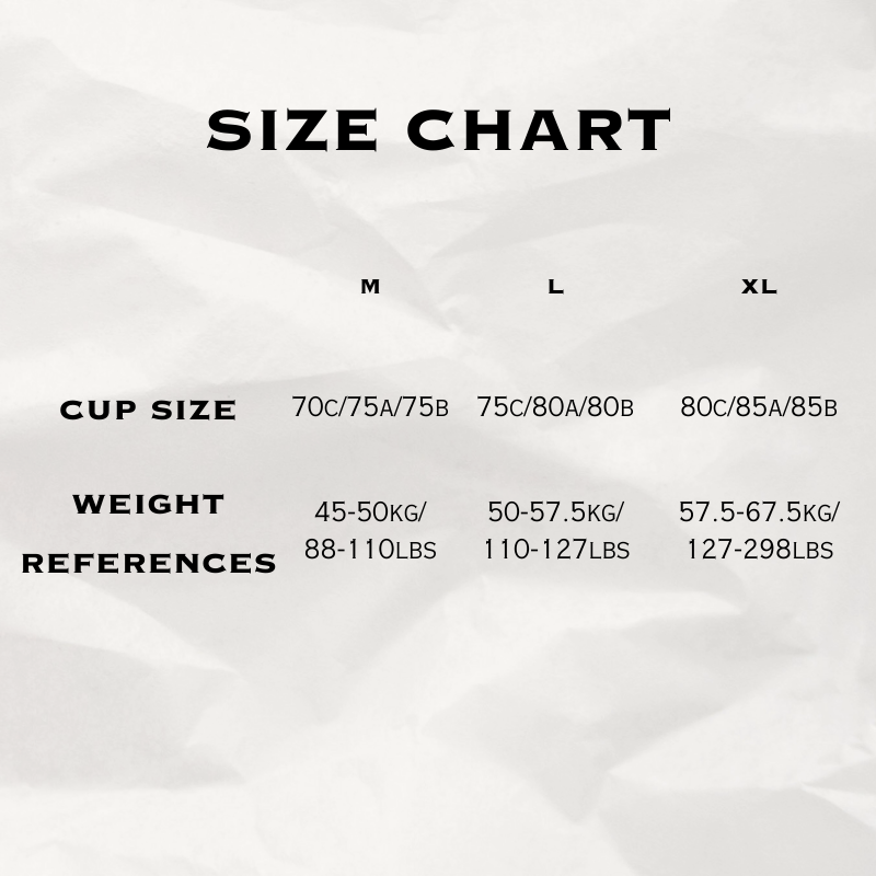 Please note that this bralette is designed without underwire and ensures a snug fit in the lower half. After extensive testing on models of different sizes during daily activities, we've settled on offering this design in three sizes to cater to a range of preferences.